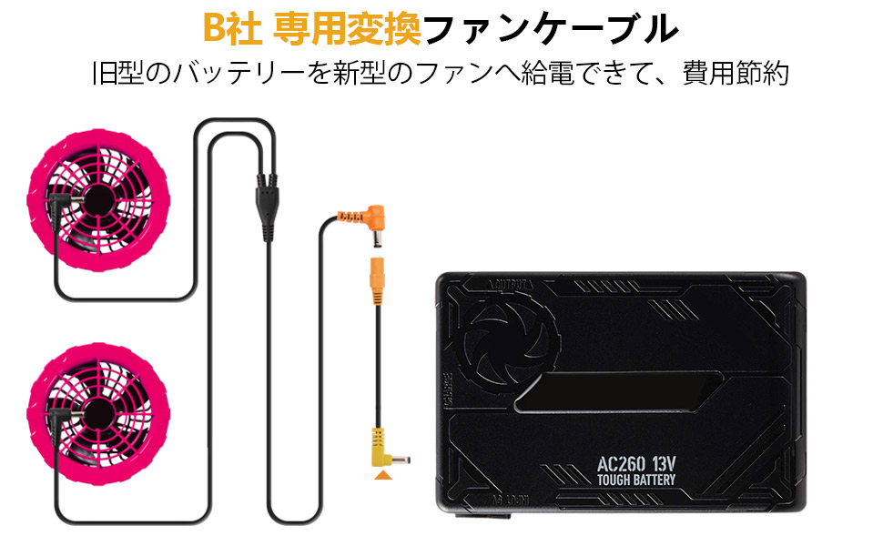 - 【ご注意】②B社新型ファン(2022年以降)をB社の旧型バッテリー(2021年以前)で動作させるケーブルで、B社の旧型バッテリー(2021年と2021年以前 AC100 AC130 AC140 AC160 AC210 AC230 AC260)を活用し、B社新型のファン(2022年と2022年以降 AC270 AC271 AC240 AC241 AC220 AC221 AC110 AC150 AC151 AC310 AC311 AC370 AC371 AC08-1 AC08-2 AC09-1 AC09-2)に給電する場合にはB社 旧型バッテリーの電圧が新型ファンの定額電圧より低いので、変換ケーブルを利用する時にファンの最大風量に達しません。この点に対して気になるお客様はご遠慮させていただきます。