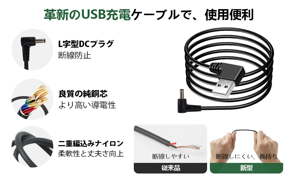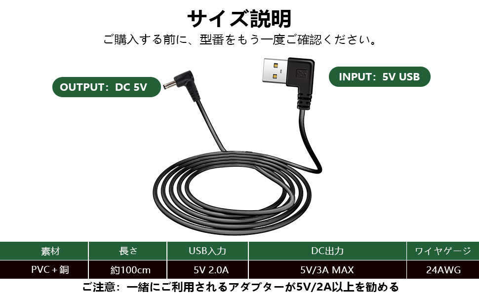 - 商品仕様:入力:USB 5V 出力:5V/2.0A ケーブル長さ:約100cm DC端子サイズ:外径3.8mm,内径1.35mm