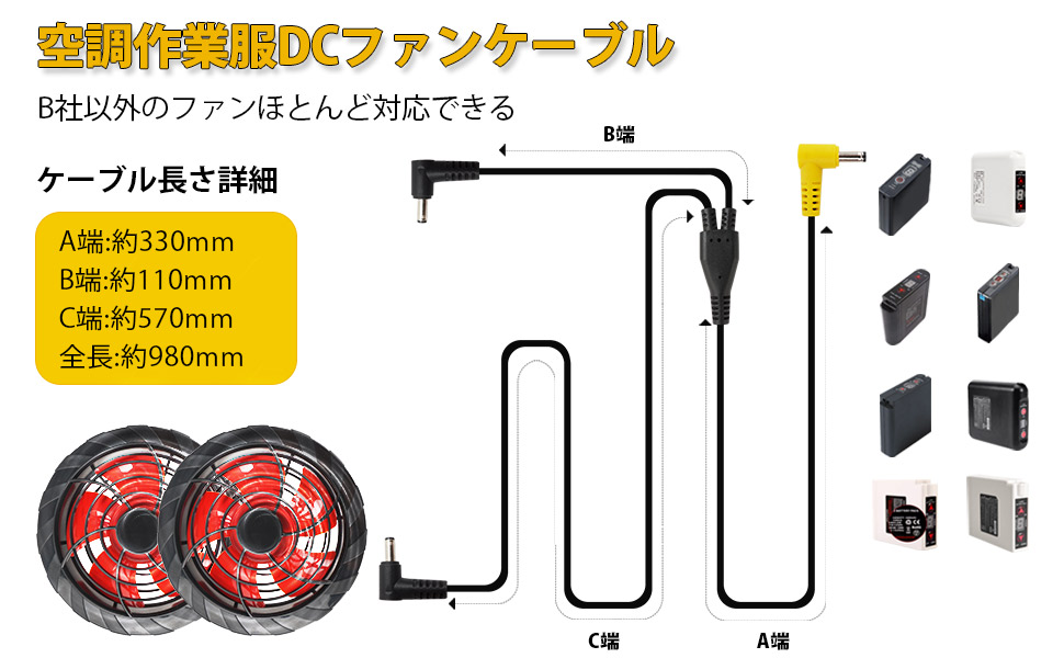 - 【空調作業服 ケーブル】空調作業服ファン用ケーブル RD9261-999-888 RD9830 PD9930 FJ4731 500kcalファン専用ケーブル。B社以外の殆どのメーカーの作業服バッテリーと空調ファンに適用できます。