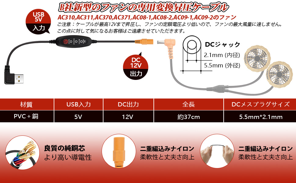 - 【作業服 USB給電 変換昇圧ファンケーブル】12V USB to DCB社専用昇圧変換ケーブルを利用することで、バートル Burtle AC300 AC360 AC08 AC09 代替品として、AC320に接続してから、B社の2022年と2022年以降のファン:AC310、AC311,AC370,AC371,AC08-1,AC08-2,AC09-1,AC09-2に給電できます。ご注意:付属品のケーブルが最高12Vまで昇圧し、B社新型ファンの定額電圧より低いので、ファンの最大風量に達しません。ご了承ください。