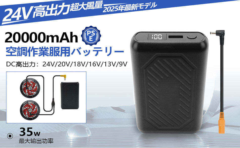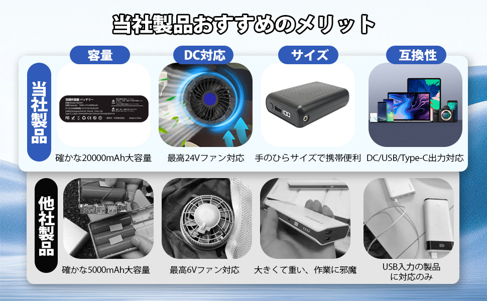 - 【24V高出力&大容量20000mAhで長時間稼働】空調作業服 バッテリー が6段階24V/21V/18V/16V/13V/9Vの超高出力でファン付き作業服に強力な冷風を供給します。確かな20000mAh大容量バッテリーが、従来より15%延長電力を供給し、長時間作業でも電池切れの心配がありません。空調ウェア バッテリー本体のサイズは:約10.5*7.0*2.9CM、重さ313gです。軽くてポータブルで持ち運び安いです。