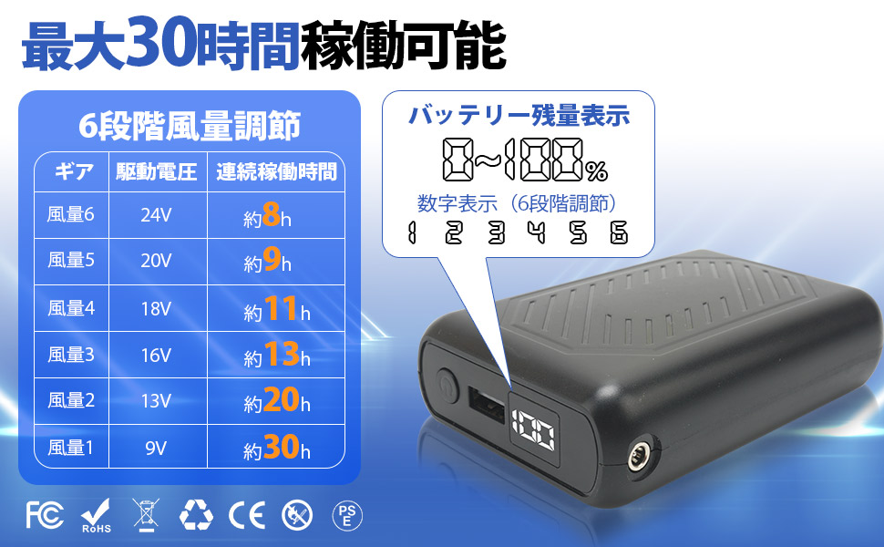 - 【6段階風量調節&LED液晶ディスプレイ搭載】 強風の要望に応えるために、 ファン付きベスト バッテリーのDC最高出力電圧は24Vに上昇します。ファンと組み合わせて使用するにより、楽に猛暑を過ごします。LED液晶ディスプレイ搭載しており、電池残量/6段階の段階数が表示されます。非常に使い安いです。