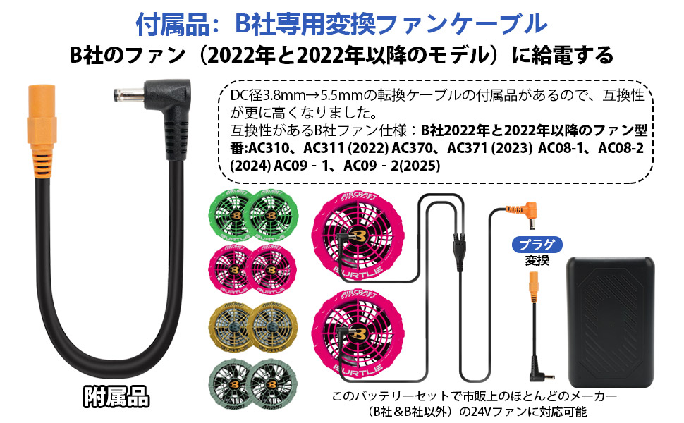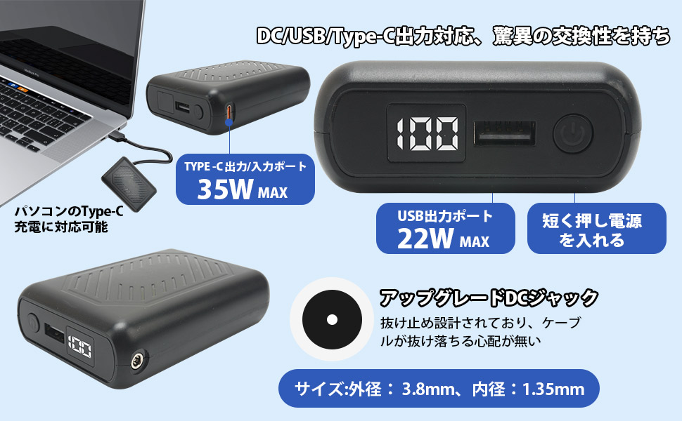 - 【3WAY出力& バートル バッテリー 代替品で万能活用】24V 空調ベスト バッテリーはType-C入出力兼用でUSB/DC/Type-C出力対応でき、空調作業服やファン付きベストに限らず、さらにUSB出力ポート(22W MAX)とType-C入力ポート(35W MAX)を備え、USB/Type-C入力に対応した機種スマホ、タブレット、パソコンなどにも適しています。また付属されている変換ケーブルの活用によって、このモバイルバッテリがB社AC300 AC360 AC08 AC09に相当し、2022年と2022年以降のファン:AC310、AC311/AC370、AC371/AC08‐1、AC08‐2/AC09‐1とAC09‐2に互換性があります。このバッテリーセットは市販上の大部分メーカー( B社&B社以外)の24Vファンに対応可能です。互換性が非常に高いです。